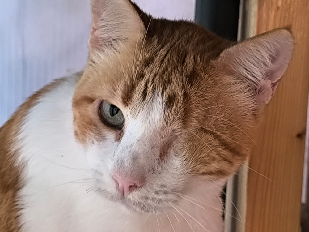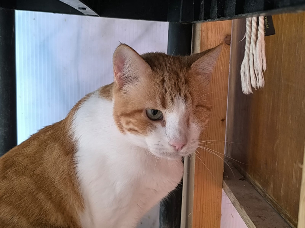 Jesus y Juanita fueron encontrados en la calle. Jesús tenía una infección en el ojo, tuvo que ser operado y se le quitó el ojo. Todo ha cicatrizado bien y Jesús no tiene ninguna limitación. Se lleva bien con sus compañeros de recinto, le gustan mucho las personas y le encanta que le acaricien. Jesus tiene un carácter cariñoso y es tranquilo y amable con todos.
