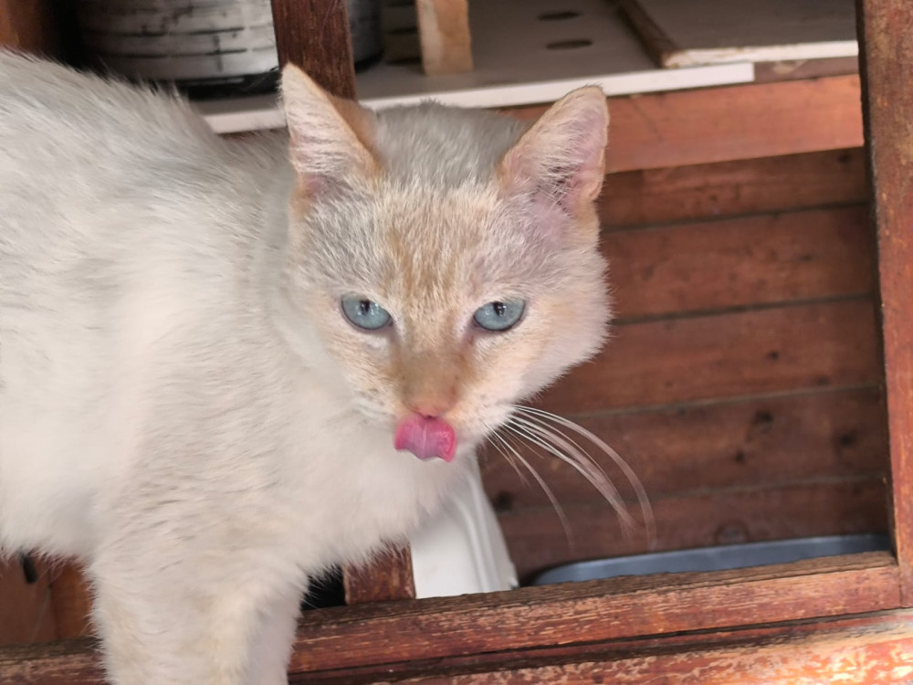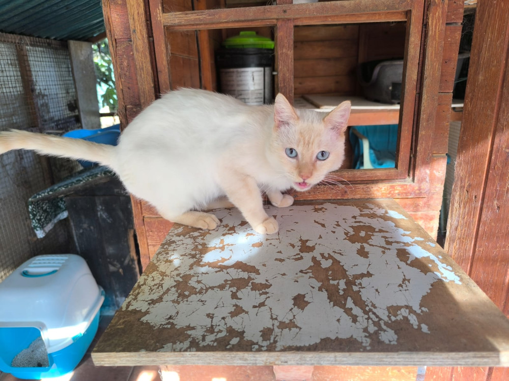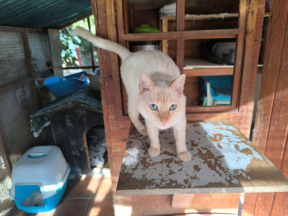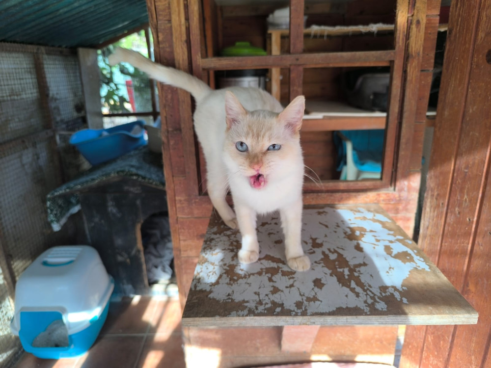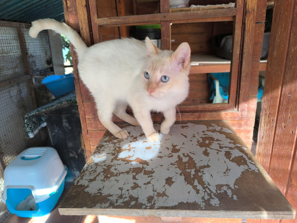 Steve was found on the street. His teeth were in terrible condition. He must have been in terrible pain. After dental surgery, he still had four teeth left, which he now uses to eat his gourmet mousse painlessly and with pleasure. Steve is very sweet and friendly towards us humans and has also made good friends among the other cats in the enclosure. His best buddy is Mango, the red tabby. Unfortunately he tested positive for feline AIDS, the feline immunodeficiency virus, but at the moment he is in perfect health!